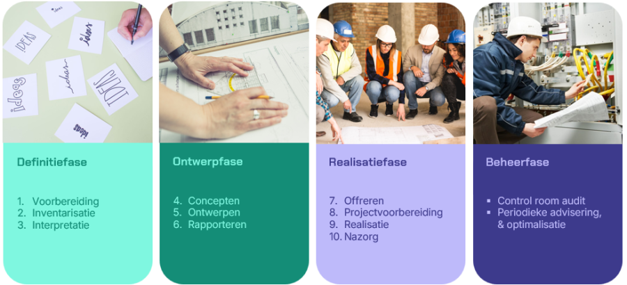 Binnen deze fasen doorlopen we tien gestructureerde stappen waarin we stap voor stap toewerken naar de nieuwe control room. We starten met het inventariseren van projectdoelstellingen, werkprocessen, toekomstverwachtingen, knelpunten en eisen, waarna we samen de uitgangspunten voor de nieuwe control room vaststellen.